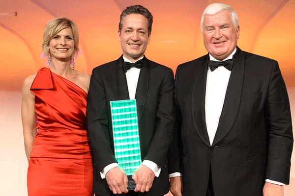 Moderatorin Barbara Hahlweg, Christian Wiest, Gründer der iThera Medical, Sieger in der Kategorie Start-ups, Klaus Engel, Vorstandsvorsitzender der Evonik Industries