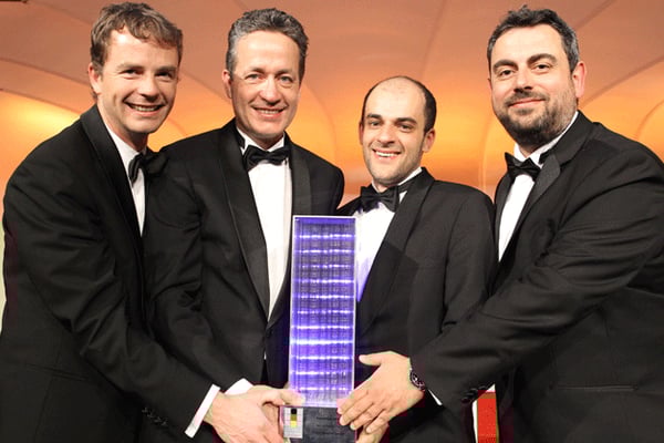 Gewinner in der Kategorie Start-up: Philipp Bell, Chief Commercial Officer von iThera Medical, Christian Wiest, Geschäftsführer, sowie die Mitgründer und Professoren Vasilis Ntziachristos und Daniel Razansky, Foto: Stefan Obermeier