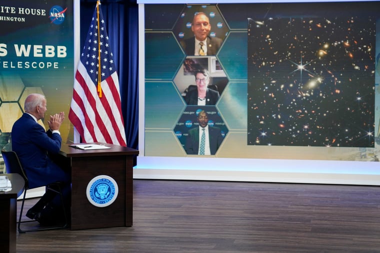Gemeinsam mit US-Präsident Joe Biden hat die US-Raumfahrtbehörde Nasa die „tiefste und schärfste bislang aufgenommene Infrarot-Sicht auf das Universum“ präsentiert. Auf der ersten Aufnahme des vor rund einem halben Jahr gestarteten Weltraumteleskops „James Webb“, die am Montag (Ortszeit) im Weißen Haus veröffentlicht wurde, sind Sterne und Galaxien zu sehen.