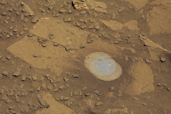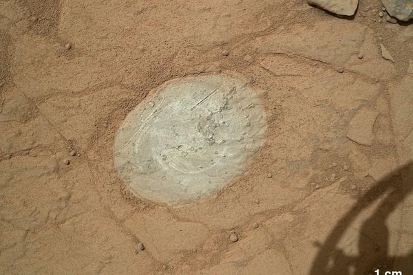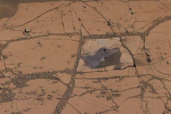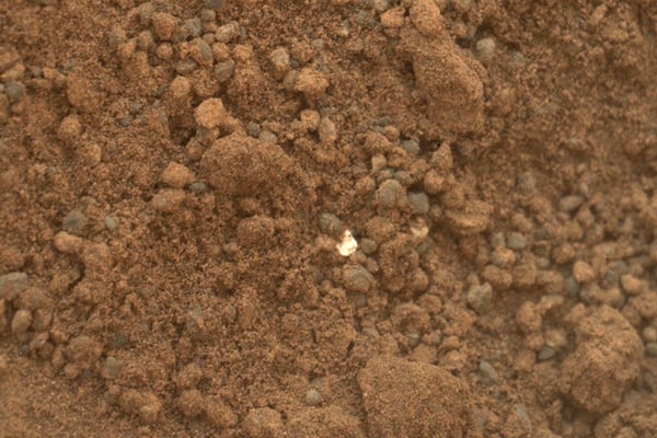 Dieser weiße Fleck inmitten des rötlichen Gerölls der Mars-Oberfläche sorgte für Irritationen. Er wurde von Curiosity fotografiert, als der Mars-Rover eine Bodenprobe zur Untersuchung nahm. Zunächst wurde vermutet, dass es sich bei dem silbrig scheinenden Teilchen um ein abgebrochenes Stück des Rovers handeln könnte. Mittlerweile gehen die Nasa-Experten aber davon aus, dass es sich schlicht um einen anders gefärbten Stein handelt.