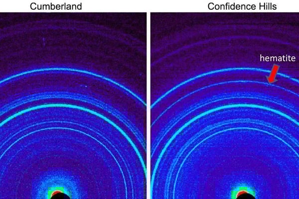 Und so sieht die Röntgen-Analyse dann aus. Links ist die Analyse einer Probe zu sehen, die Curiosity bereits 2013 in der Marsregion "Cumberland" nahm. Rechts sieht man die Analyse der neuen Bohrprobe aus der Region "Confidence Hills" am Mount Sharp. Der rote Pfeil weist auf den Ring, der das Mineral Hämatit (auch Blutstein oder Eisenglanz genannt) anzeigt. Hämatit kommt auch auf der Erde häufig vor. Es handelt sich um ein bestimmtes Eisen-Oxid, das in der anderen von Curiosity entnommenen Probe nicht vorhanden war. Hämatit gilt als ein Nachweis für Wasservorkommen auf dem Mars.
