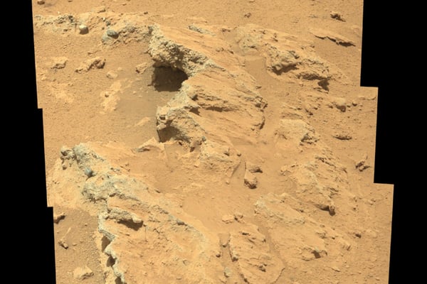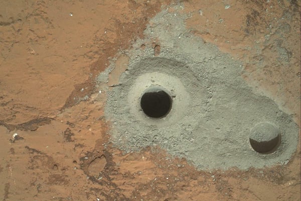 Die "Mars Hand Lens Imager"(Mahli)-Kamera des Marsrovers hat das Loch fotografiert, dass Curiosity Ende September in die Basis der Formation Mount Sharp gebohrt hat. Die Gegend wird "Pahrump Hills" genannt. Das Loch misst 1,6 Zentimeter im Durchmesser und ist 6,7 Zentimeter tief.