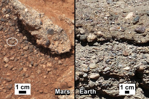 Die Bildkombination zeigt zwei Fotos, von denen das linke Curiosity in einem ausgetrockneten Flussbett auf dem Mars gemacht hat. Das rechte Foto zeigt eine vergleichbare Aufnahme von der Erde.