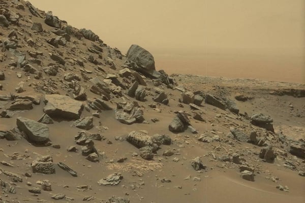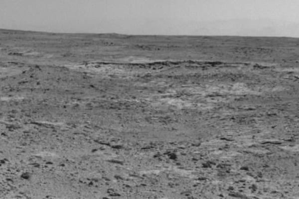 Der Rover sendet neue Fotos vom Mars: Im Hintergrund der Aufnahme ist der Rand des Gale-Kraters zu sehen, in dem Curiosity seit 2012 aktiv ist. Geologisch ist die Region besonders interessant, da sie die Untersuchung zahlreicher Gesteinsschichten ermöglicht. Der etwa fünf Kilometer hohe Mount Sharp liegt in der Mitte des Gale-Kraters.