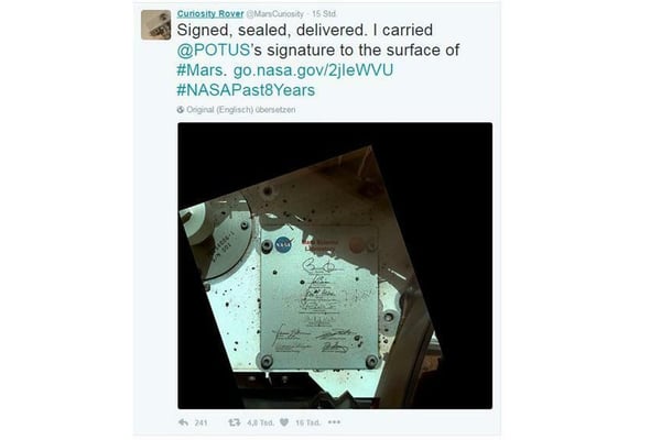 US-Präsident Barack Obama verlässt das Weiße Haus - und auch Curiosity verabschiedet sich. Auf der Kurznachrichtenplattform Twitter teilte das Social-Media-Team des Rovers ein Bild, dass die Unterschrift Obamas zeigt. "Unterzeichnet, versiegelt, ausgeliefert. Ich habe die Unterschrift des US-Präsidenten auf die Oberfläche des Mars gebracht", heißt es in dem Tweet. Es zeigt eine Plakette, die auf Curiositys Deck angeschraubt ist. Aufgenommen hatte der Rover das Bild bereits am 44. Tag seiner Mars-Expedition im September 2012.