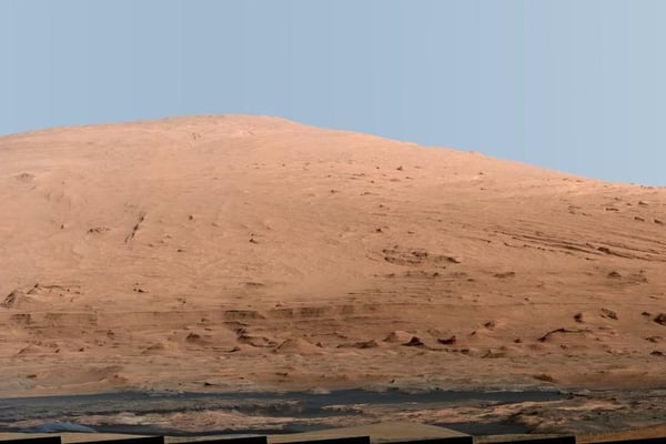 Das zusammengesetzte Foto zeigt das abgerundete Massiv vor einem auffallend blauen Himmel. Dabei wurde mit einem Weißabgleich nachgeholfen, um erdähnliche Lichtverhältnisse zu schaffen. Das menschliche Auge würde normalerweise einen bräunlichen Marshimmel sehen. Der Forschungsroboter, der im August 2012 auf dem Mars gelandet ist, soll im Rahmen seiner Mission auch den Mount Sharp erkunden.