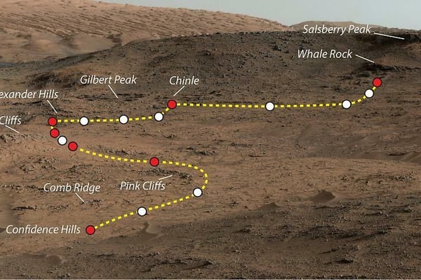 Eigentlich sollte Curiosity Mount Sharp schon früher erreichen, aber nach Problemen mit den Rädern hatten die Forscher die Route des Roboters verändert, so dass er durch ebeneres Terrain rollen konnte.