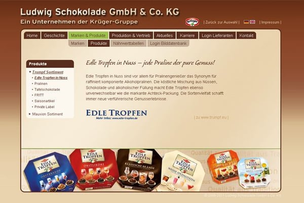 „Edler Genuss in Nuss“, mit dieser Werbung machte die Marke Trumpf in den 1990 Jahren auf ihr wohl bekanntestes Produkt die „Edlen Tropfen“ aufmerksam – eine mit Weinbrand gefüllte Pralinenmischung. Die Marke Trumpf wird von der Ludwig Schokolade GmbH & Co KG hergestellt, die ihrerseits zur Krüger-Gruppe gehört. Bei Schokofreunden sind auch die kleinen gefüllten Schogetten und die Luftschokolade Aero beliebt. Trumpf beliefert die Discounter Aldi und Lidl und zählt mit rund 1500 Mitarbeitern zu den größten Herstellern für preiswerte Schokolade in Deutschland.