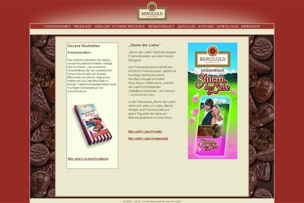 Bekannt ist Berggold für seine Pralinenspezialitäten. Seit Februar 2010 stellt das ostdeutsche Unternehmen eine Pralinenauslese zur ARD-Telenovela Sturm der Liebe her. Das Traditionsunternehmen stellt seit 1876 Pralinen und Süßwaren her. Nach der Umwandlung in eine GmbH im Jahr 1990, mit der Treuhandanstalt als Gesellschafter, folgte 1991 die Privatisierung durch die Heinerle Spiel- und Süßwaren GmbH Bamberg. Diese verlegte 1996 ihre Produktionsstätten nach Pößneck. Heute sind dort noch etwas 120 der ehemals 600 bis 900 Mitarbeiter beschäftigt.