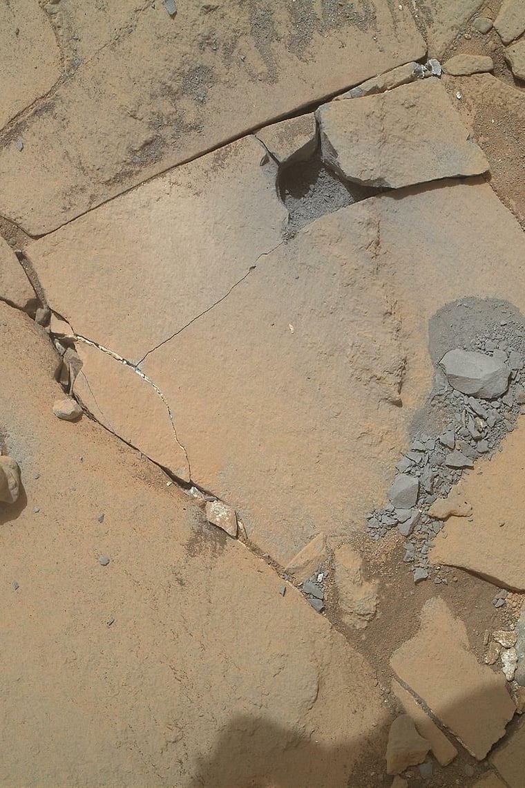 Die "Mars Hand Lens Imager"(Mahli)-Kamera des Marsrovers hat das Loch fotografiert, dass Curiosity Ende September in die Basis der Formation Mount Sharp gebohrt hat. Die Gegend wird "Pahrump Hills" genannt. Das Loch misst 1,6 Zentimeter im Durchmesser und ist 6,7 Zentimeter tief.