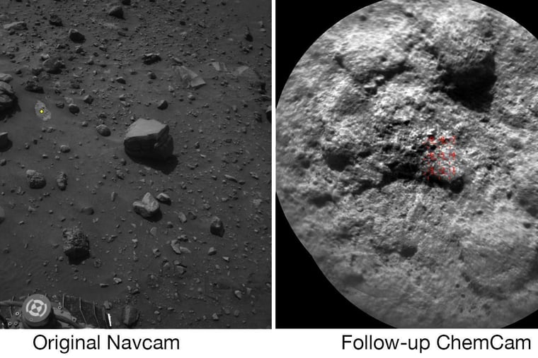 Dieses Bild zeigt den pyramidenförmigen Felsbrocken, den Curiosity entdeckt und untersucht hat. Der Stein hat den Namen "Jake Matijevic" erhalten. Die roten Punkte markieren die Stellen, die der Rover mit seinem Laser beschossen hat. Die Kreise zeigen die Zonen, die mit einer speziellen Kamera und einem Spektrometer untersucht wurden. Wie die Nasa am 11. Oktober mitteilte, handelt es sich um eine bisher unbekannte Gesteinsart.
