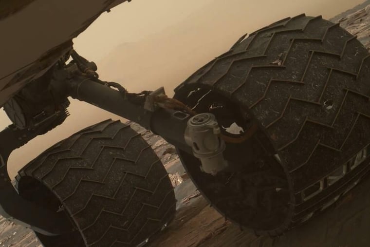 Curiosity hat inzwischen deutliche Abnutzungsspuren. Ein Routine-Check der Reifen im März zeigt, dass es am linken mittleren Reifen zwei Brüche der sogenannten Stege im Profil gibt (im Bild ist einer davon leicht abstehend oben am Reifen zu sehen). Der Rover hat während seiner Reise über den Roten Planeten inzwischen etwa 16 Kilometer zurückgelegt. Curiosity-Projektmanager Jim Erickson sagte, alle sechs Reifen hätten trotz der sichtbaren Schäden noch genug Lebenszeit, um den Rover zu allen geplanten Orten zu bringen.