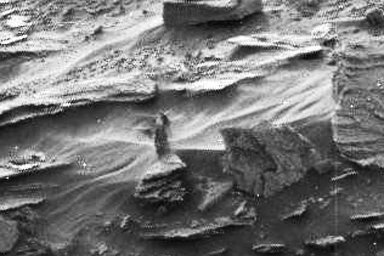 Ein Bild, das der Rover auf seiner Expedition schoss, sorgt für Wirbel im Netz und begeistert die Verschwörungstheoretiker. Es geht um die gleichmäßige, spitze Formation (im roten Kreis), die darauf zu sehen ist. Handelt es sich dabei etwa um eine Pyramide? Die Theorie einer untergegangenen Zivilisation, die einst monumentale Bauwerke auf dem Mars errichtete, versetzt Ufo-Fans in Ekstase. Ist hier die Spitze einer verschütteten Pyramide zu sehen und der Beweis für Leben auf dem Mars erbracht? Die Wahrheit dürfte viel langweiliger sein. Vermutlich handelt es sich einfach um einen von Wind und Staub ungewöhnlich glatt geschliffenen Stein. Den Rest übernimmt unsere Fantasie - wie zum Beispiel schon, als die "Bild"-Zeitung 2014 einen vermeintlichen Mars-Menschen entdeckte.