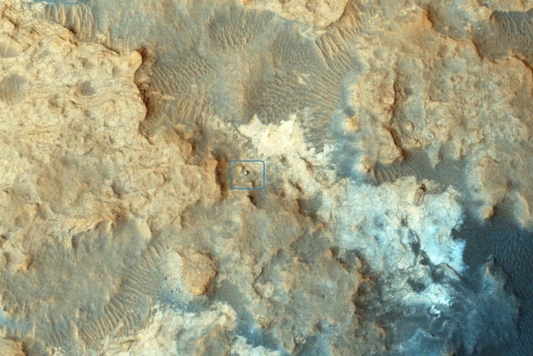So sieht die Bohr-Stelle herausgezoomt aus. Bei den Bohrungen lösten sich Staub und Steine von dem etwa fünf Kilometer hohen Berg, die herunterrutschten und nun rings um die Bohrung zu sehen sind. Die Stelle befindet sich auf einem flachen Felsstück, das "Confidence Hills" genannt wird.