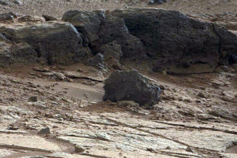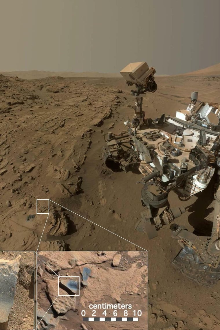 Das Bild zeigt Curiosity an der Stelle, wo er große Anteile Manganoxid im Sandstein des Mars gefunden hatte. Der entsprechende Stein ist im Foto unten vergrößert dargestellt.