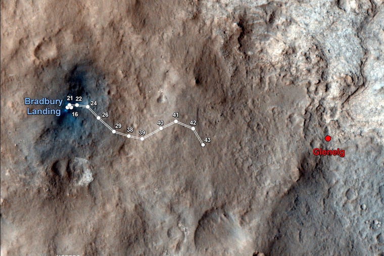 Auf dieser Karte ist zu sehen, welchen Weg der Roboter am 43. Tag seiner Mission zurücklegte. Bradbury Landing ist der Ort an dem er begonnen hat, bevor er letztlich seinen Weg über die markierten Punkte fortgesetzt hat. Glenelg soll die erste größere wissenschaftliche Mission darstellen. Dort wird er Pulver aus einem Felsen analysieren.