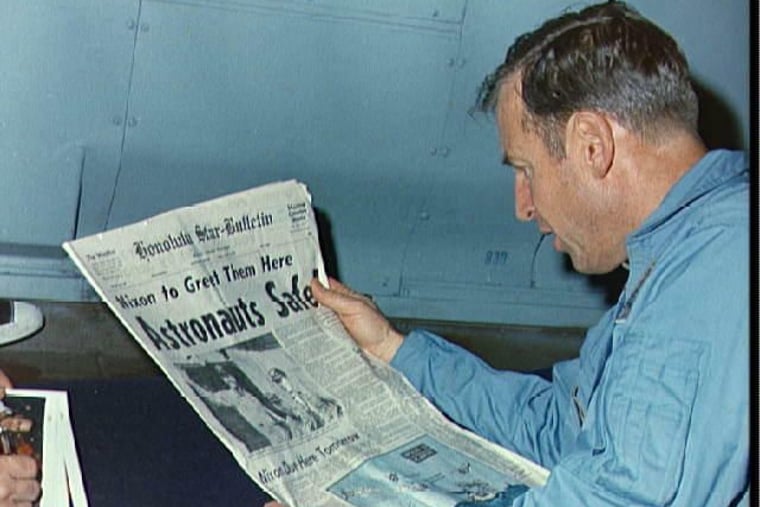 James Lovell (Apollo 8) nach einer Mondumrundung, bei der die Apollo-8-Astronauten als erste Menschen die Rückseite des Mondes gesehen hatten.