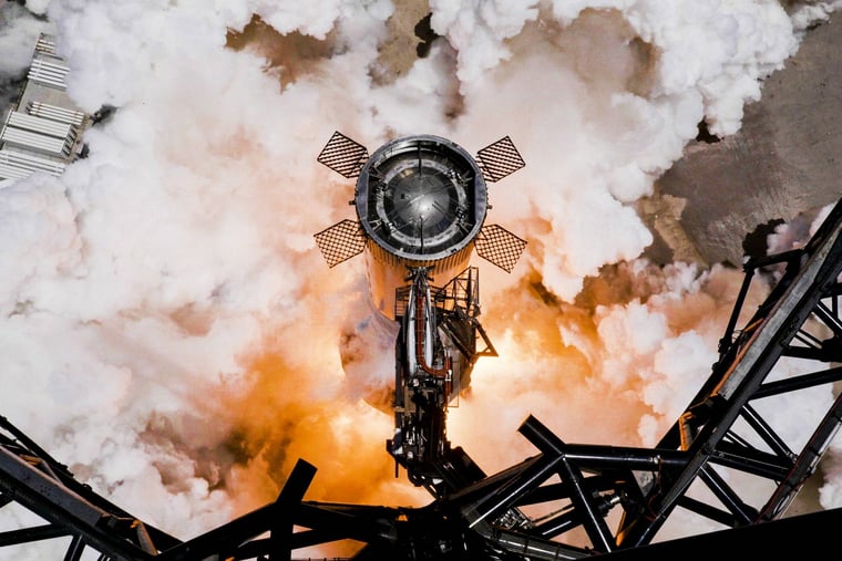 Der Super Heavy Booster des Starships von SpaceX bei einem Testdurchlauf.