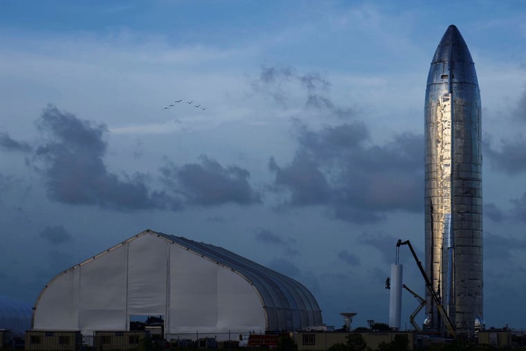 Ein Prototyp des Raumschiffs Starship wartet am Weltraumbahnbahnhof von SpaceX in Boca Chica auf einen Flugtest.