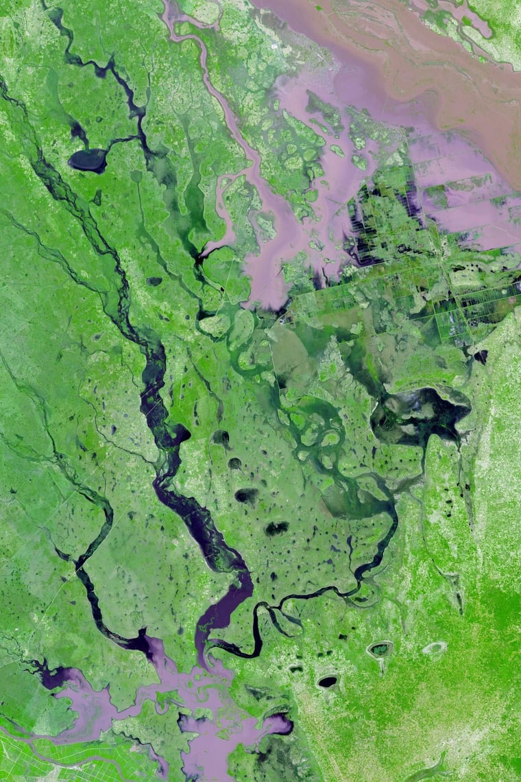 Bei hellem Tageslicht sehen wir hier die Inseln des Mergui-Archipel im Indischen Ozean vor der Küste Myanmars. Flüsse transportieren Sediment vom Festland ins Meer und lassen den vergleichsweise flachen Ozean rund um die mehr als 800 Inseln hellblau bis weiß erscheinen. In deutlichem Kontrast dazu steht das Dunkelblau der Tiefsee am linken Rand des Bildes.