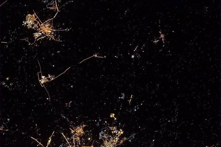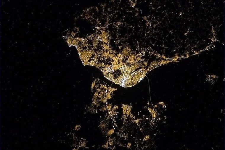 Wie ein Himmel voller Sterne sieht Lissabon in Portugal aus dem All aus. Der Astronaut Chris Hadfield meint darin ein kompliziertes Spinnennetz der umliegenden Städte zu entdecken.