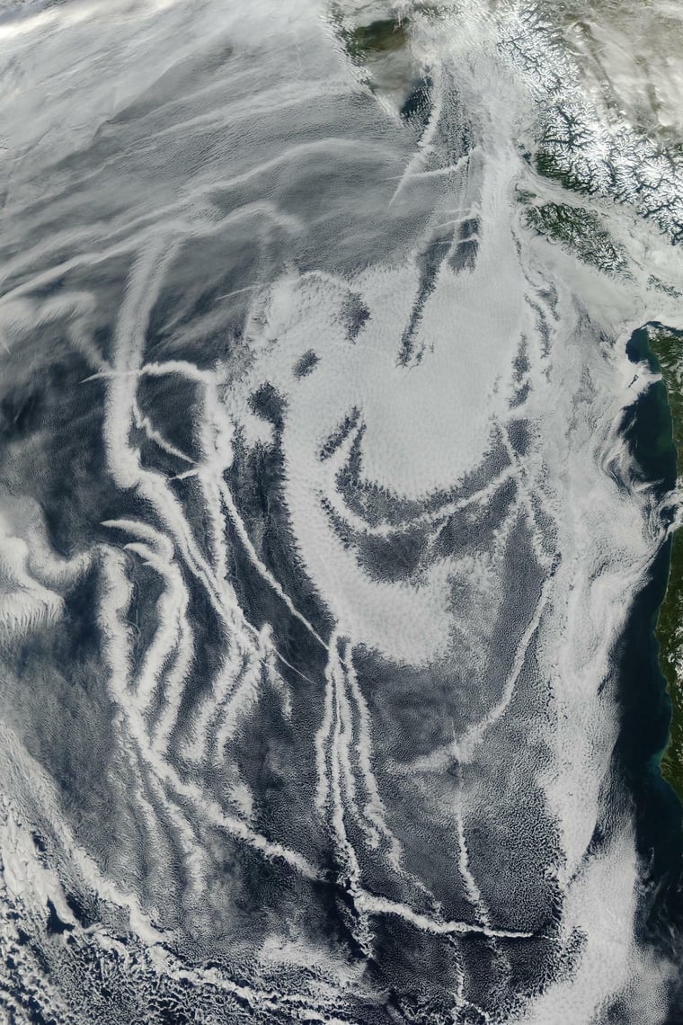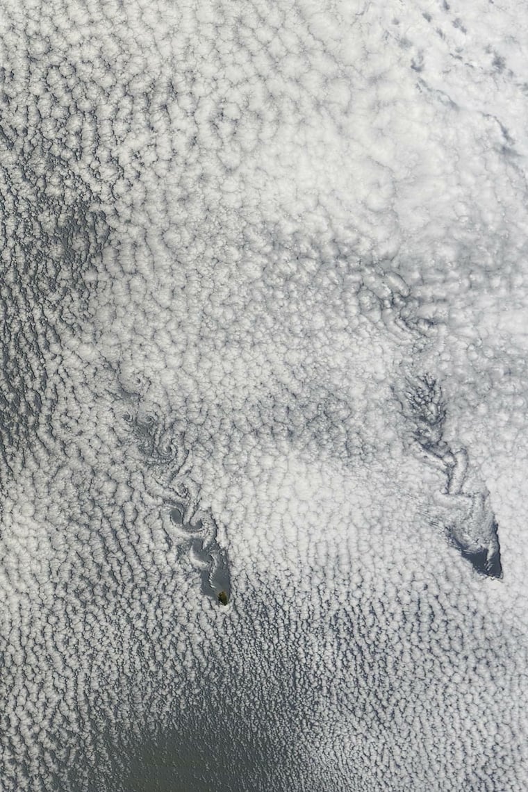 Diese merkwürdigen Wolkenwirbel werden von zwei Inseln vor der Küste Chiles verursacht. Beide Eilande werden von hohen Bergen überragt, deren Gipfeln für Turbulenzen in höheren Luftströmungen sorgen.