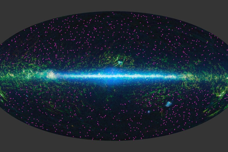 Auf dem zusammengesetzten Bild des Himmels sind die neu entdeckten Galaxien als lila Punkte markiert. In der Mitte ist das Band unserer Milchstraße zu sehen.