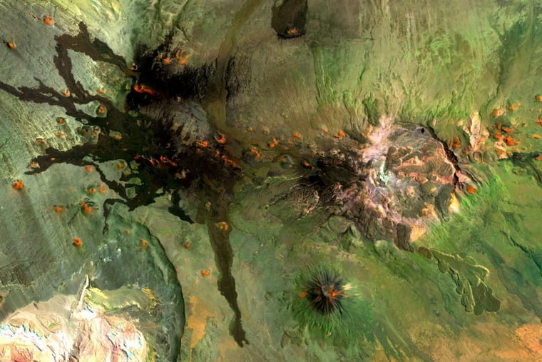 Vulkane zählen zu den spektakulärsten Naturschauspielen und sind auch aus dem All gut zu erkennen. Hier sehen wir das Vulkanfeld des argentinischen Feuerbergs Payun mit seinen mehr als 300 aktiven Schloten.