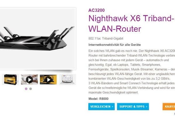 Der Router Nighthawk X6 R8000 funkt mit sechs Antennen mit bis zu 3,2 Gigabit pro Sekunde. Dank eines Netzwerklastausgleichs optimiert der Router die WLAN-Frequenzen für angemeldete Geräte. Ende März kommt das Gerät für rund 300 Euro in den Handel. Auf der Cebit können es Besucher schon einmal vorab in Augenschein nehmen.