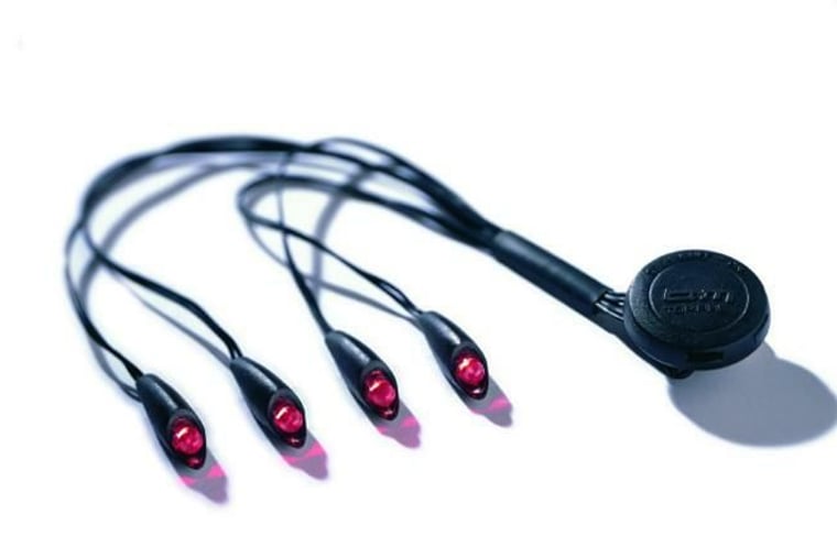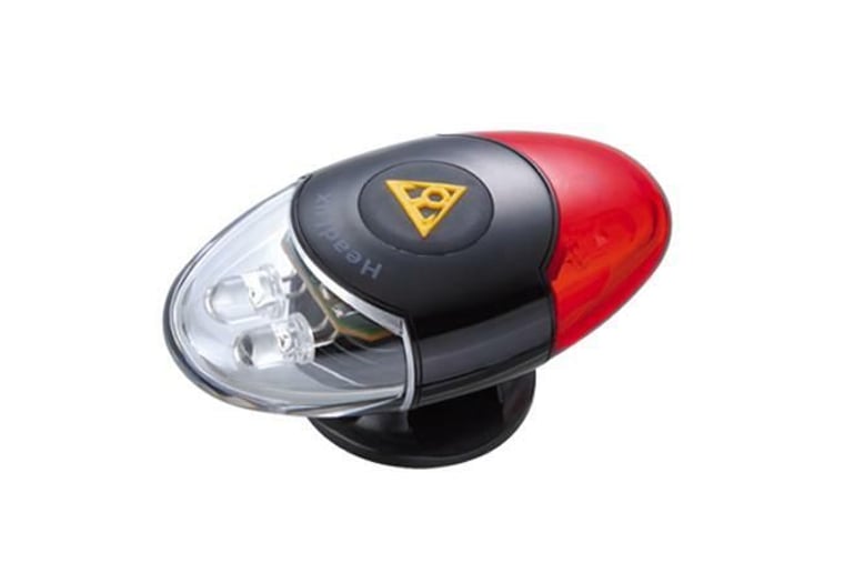 Helmlampe mit zwei weißen und zwei roten LED, die entweder blinken oder konstant leuchten.