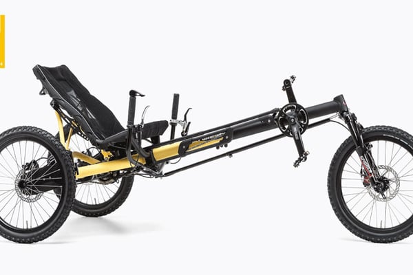 Ein Liegerad, mit dem man auch durch unwegsames Gelände brettern kann. Stollenreifen im 20-Zoll-Format und luftgefederte Einzelradaufhängung bieten ideale Voraussetzungen für den Spaß-Trip abseits der Straßen. Scheibenbremsen sorgen für prompte Verzögerung.
