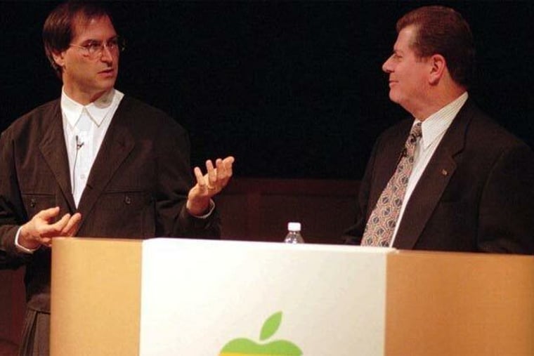 In den 1980er und 1990er Jahren war Apple unbestreitbarer Innovationsführer seiner Branche: Der erste massentaugliche PC mit Mausbedienung und grafischer Oberfläche kam ebenso aus dem Hause Apple wie das innovative Videosystem Quicktime, der erste Laptop mit TFT-Bildschirm und der erste elektronische Terminkalender (PDA) mit dem Namen Newton. Auf dem Bild stellen Steve Jobs (links) und der damalige Apple-Präsident John Sculley 1984 auf einer Aktionärsversammlung im kalifornischen Cupertino ihre ersten Macintosh-Computer vor.