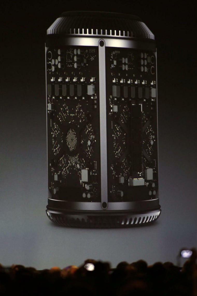 Der Mac Pro bekommt ein ungewöhnliches Design in Form eines glänzenden schwarzen Zylinders, der viel kleiner ist als die bisherigen großen Kästen. Die Leistung wurde im Vergleich zur vorherigen Generation verdoppelt.