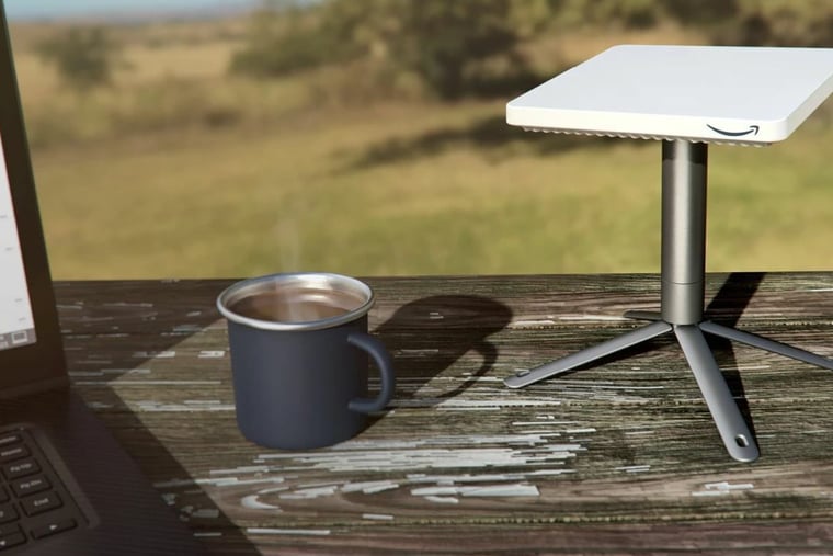 Erste Bilder der Empfangsantennen für das Satelliteninternet, die Amazon nun vorgestellt hat, versprechen genau das. Das kleinste, tragbare Modell ist nur knapp 18 Zentimeter lang und wiegt 450 Gramm und ist damit kompakter als ein Taschenbuch. Es lässt sich mit wenigen Handgriffen per Mini-Stativ auf dem Tisch neben den Laptop aufstellen.