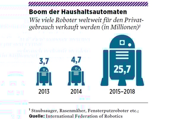 Rund fünf Millionen Serviceroboter wurden 2014 bereits verkauft – bei den Industrierobotern waren es im gleichen Zeitraum nur 230.000 Stück. Von 2015 bis 2018, prognostiziert der Branchenverband International Federation of Robotics (IFR), werden 35 Millionen Dienstleistungsroboter ihren Job aufnehmen. Der größte Teil, fast 26 Millionen, wird in Haushalten arbeiten.