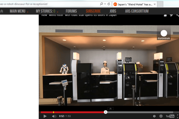 An der Rezeption werden die Gäste von freundlichen aber teilweise auch seltsamen Robotercharakteren begrüßt und bedient. Neben der freundlichen Dame in der Mitte ist zum Beispiel rechts ein Dinosaurier im Einsatz. Das Ein- und Auschecken geschieht vollautomatisch. Das Hotel ist schlüssellos, die Gästeidentifizierung erfolgt über Gesichtserkennung. Wer durch die installierten Kameras erkannt wird, erhält Einlass ins Hotel und ins Zimmer.