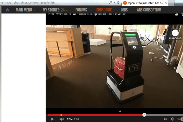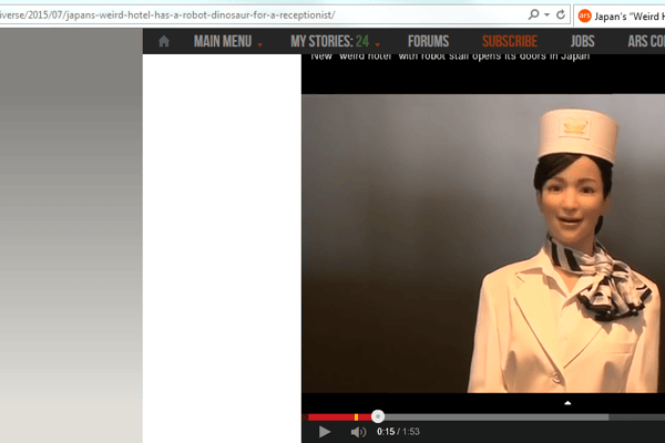 Hier stellt sich einer der Rezeptionsroboter vor. Diese Dame ist für die japanischen Gäste zuständig und soll bei allen Fragen auf freundliche und natürliche Art helfen können. Beim Thema Sicherheit verlassen sich die Betreiber jedoch nicht auf Maschinen. Die 24-Stunden-Videoüberwachung des Hotels wird von echten Menschen übernommen.