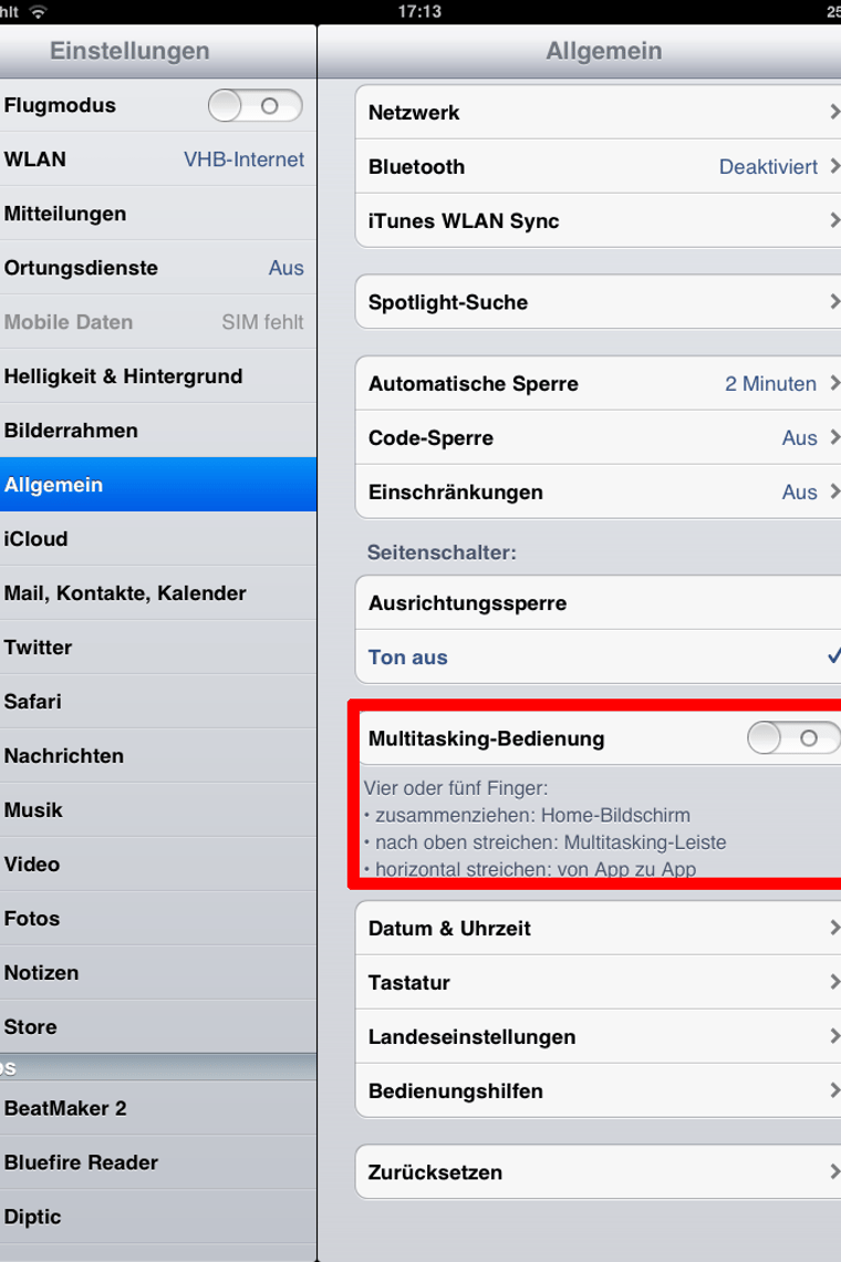 Die Multitasking-Bedienung erleichtert das schnelle Arbeiten mit dem iPad. Sie aktivieren die Funktion bei “Einstellungen” → “Allgemein”. Wenn Sie mit vier oder mehr Fingern auf dem angeschalteten Display nach oben streichen, erscheint die Multitasking-Leiste (Musik, Bildschirmhelligkeit, Ausrichtungssperre). Wenn Sie bei einer geöffneten App mit vier oder mehr Fingern nach rechts oder links streichen, wechseln Sie zwischen den bereits geöffneten Anwendungen hin und her.