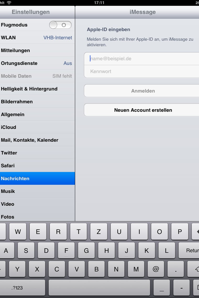 Mit dem iPad können Sie über "iMessages" Nachrichten verschicken. Um die kostenlosen Nachrichten senden zu können, benötigen Sie die E-Mail-Adresse des anderen Nutzers. Diese finden Sie unter “Einstellungen” → “Nachrichten” → “Senden & Empfangen”. Die Nachrichten werden übrigens mit Ihren anderen iOS-Geräten synchronisiert, so kann man eine Konversation auf dem iPhone fortführen.