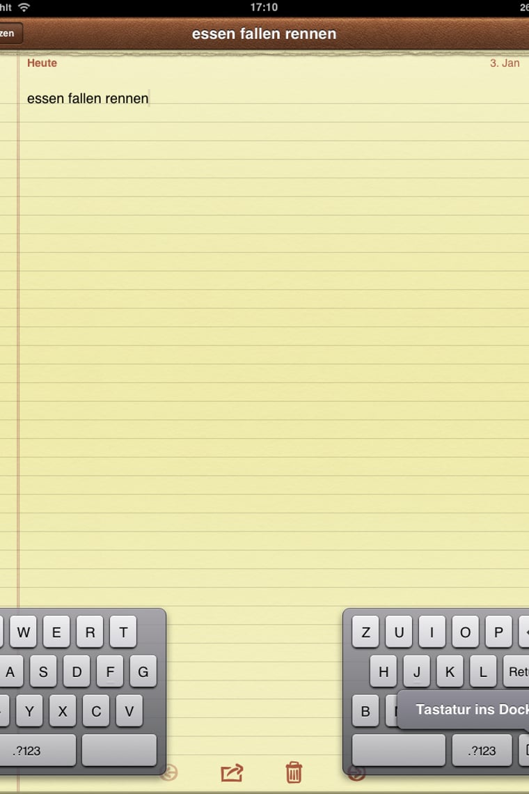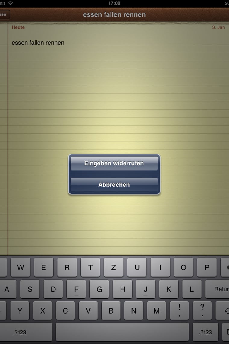 Wenn Sie einen Text wieder löschen wollen, können Sie einfach ihr iPad schütteln. Dann poppt ein Fenster auf. Tippen Sie dann auf “Eingeben widerrufen” und Ihr gesamter Text wird gelöscht.