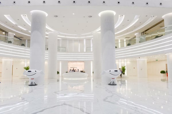 JD bildet in China die Speerspitze beim Versuch, mit Künstlicher Intelligenz und autonomen Robotern dem Kräftemangel Abhilfe zu schaffen – sogar in der eigenen Zentrale. Im Pekinger Südwesten, rund eine Autostunde vom Zentrum entfernt, erstreckt sich ein imposanter Glasklotz in die Höhe, 14.000 Mitarbeiter arbeiten hier. In der verwinkelten Lobby strahlen die weißen Marmorböden mit den Deckenleuchten um die Wette. Hier können die Angestellten einkaufen, Tee trinken, sich finanziell beraten lassen – und dienen dabei immer auch als eine Art Versuchsobjekte für neueste Technologien.