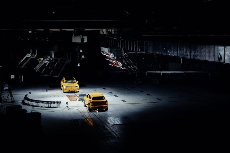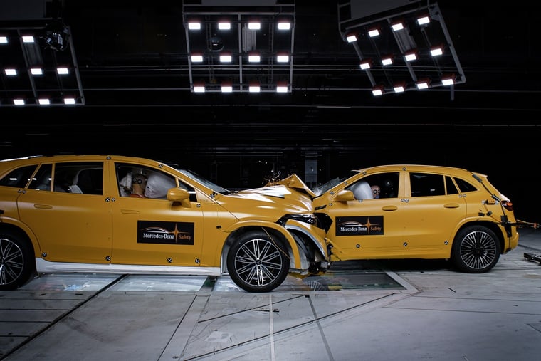 Crashtest in Sindelfingen: Diesmal trafen ein EQS SUV und ein EQA gegeneinander an.