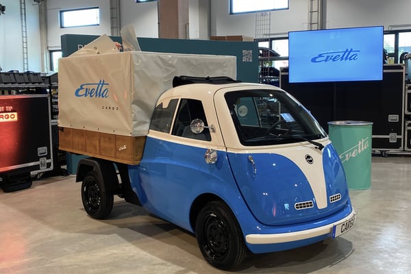 Ursprünglich wurde die Evetta von der Firma Artega entwickelt. Electric Brands übernahm von dort sämtliche Projektideen, die Entwicklungspläne sowie die kleine Fertigungsstraße, die jetzt in Rosdorf bei Göttingen steht. Neben kleineren Optimierungen am Basismodell haben sie das Angebot um eine Cargo- und Cabrio-Variante ausgebaut. Ab 22. Juli ist die Evetta online bestellbar, produziert werden soll sie ab Sommer 2023: Das Basismodell Prima soll 16.000 Euro kosten, die Cabrio-Variante Openair gibt es ab 21.000 Euro und die Lastenversion Cargo für rund 18.500 Euro.