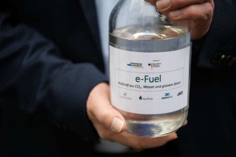 06.11.2019, Baden-Württemberg, Eggenstein-Leopoldshafen: Ein Besucher einer Feier zur Inbetriebnahme einer Forschungsanlage, mit der mittels «Power-to-X»-Technologien (P2X) aus Luft und Ökostrom CO2-neutraler Kraftstoff erzeugt werden kann, hat auf dem Campus Nord des Karlsruher Institut für Technologie (KIT) eine Flasche mit e-Fuel in der Hand. Foto: Marijan Murat/dpa +++ dpa-Bildfunk +++