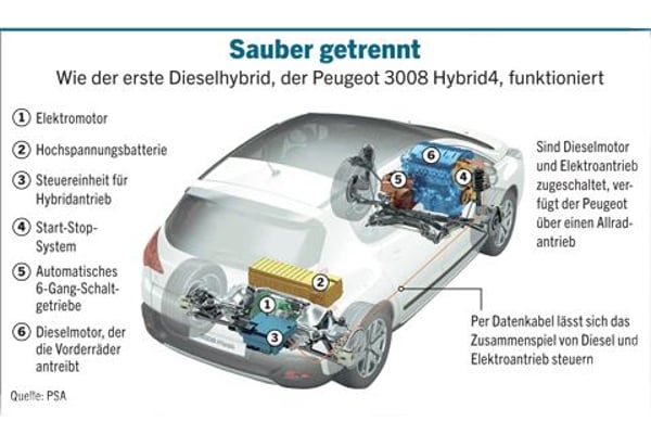 Das ist vorbei. Hersteller wie Peugeot und Citroën aus dem französischen PSA-Konzern sowie Mercedes, Volvo und Land Rover glauben, eine Lösung zu haben: Sie haben vor allem den Elektroantrieb geschrumpft und das Zusammenspiel mit dem Dieselmotor wesentlich verbessert. Peugeot war damit am schnellsten und bringt Ende des Jahres mit dem 3008 Hybrid4 den weltweit ersten Dieselhybrid auf den Markt. Die anderen Hersteller ziehen 2012 nach.
