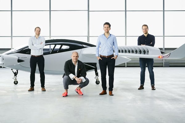 Daniel Wiegand (dritter von rechts) ist Mitgründer und CEO von Lilium. Zusammen mit Sebastian Born, Patrick Nathen und Matthias Meiner (von links nach rechts) gründete Wiegand im Jahr 2015 das Start-up Lilium. Zusammen wollen sie das weltweit erste Flugtaxi an den Start bringen.