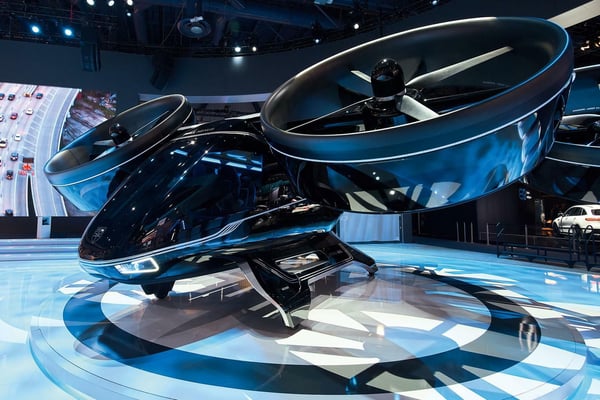 Der US-Helikopterhersteller Bell hat mit dem Air Taxi ein variables Konzept für Fluggeräte entwickelt, das zwei bis sechs Personen transportieren soll. Neigbare Rotoren sorgen je nach Flugphase mal für Auftrieb, mal für Vortrieb.