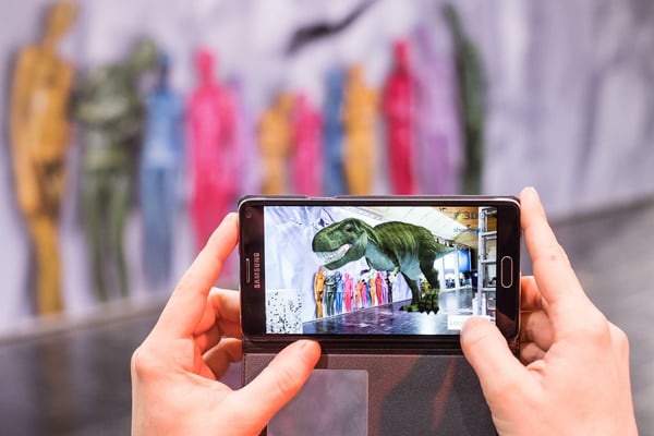 Das Skelett von Tyrannosaurus Tristan steht im Berliner Naturkundemuseum. Mit einer App der Firma Shoutr lässt sich die Echse jedoch in die Cebit-Hallen holen, und zwar samt Haut und Fleisch: Das Programm legt eine lebensechte Animation des Tiers über das Bild der realen Umgebung - Augmented Reality nennen Experten das Prinzip, das beispielsweise die Exponate in Museen zum Leben erweckt.