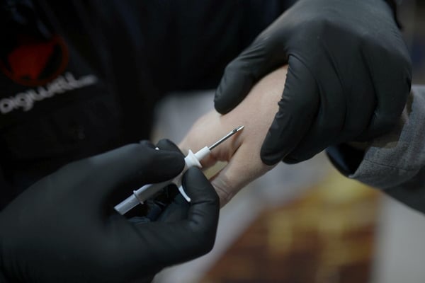 Nein, das soll keine Tätowierung werden: Am Stand der Firma Digiwell lässt sich ein Besucher einen RFID-Chip unter die Haut setzen. Der soll Türen per Funk öffnen und Passwörter abspeichern können. Künftig denkbar seien auch medizinische Anwendungen, etwa die permanente Messung von Blutzuckerwerten. Die Aktivisten wollen so den menschlichen Körper erweitern.