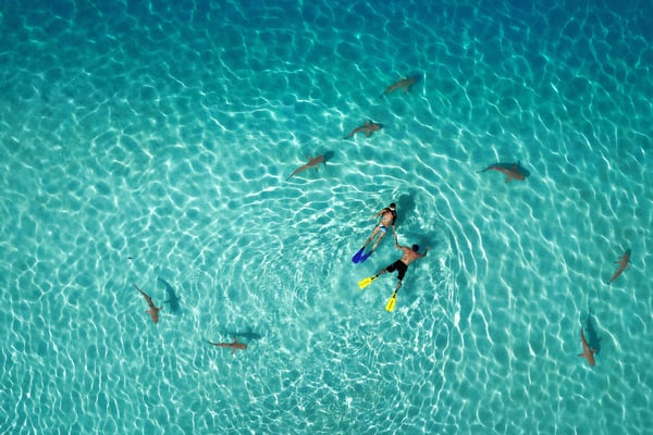 Schnorcheln mit Haien in der freien Natur von Französisch-Polynesien, nahe der Insel Moorea. Drohnenfotograf Tim McKenna hatte Glück und perfekte Bedingungen für das Bild. Die Haie kamen genau zur richtigen Zeit, um die Schnorchler zu umrunden.